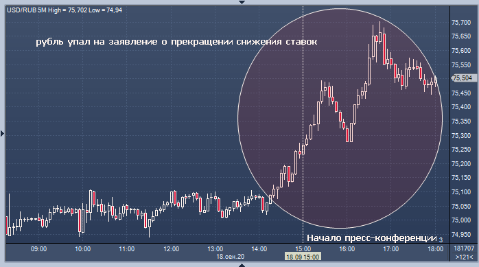 На графике интервалами 5 минут видим снижение рубля к доллару после слов Набиуллиной