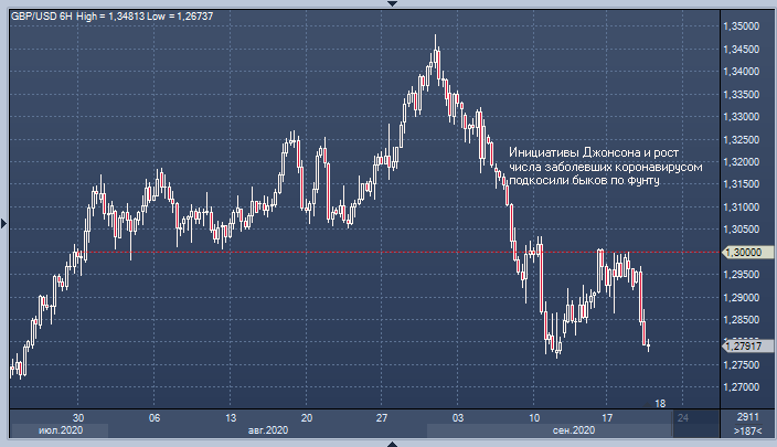 Формирование второй волны пандемии в Великобритании выглядит очевидным, и главный советник правительства по вопросам науки признал, что в отсутствии срочных мер страна уже к середине октября выйдет на уровень в 50 000 новых случаев заражения в день, а еще через месяц ежедневное число погибших от вируса достигнет 200 и более человек. Его призыв к ограничению социальных контактов никак нельзя назвать позитивным для фунта, учитывая печальный опыт локдауна британской экономики.