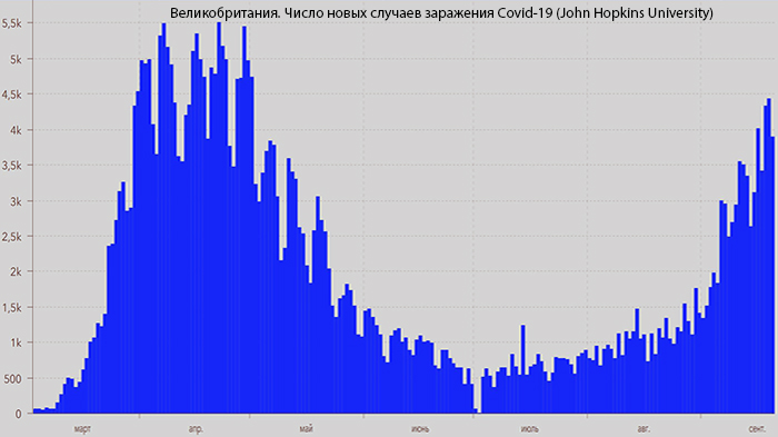 На изображении представлена динамика новых подтверждённых случаев заражения Covid-19 в Великобритании (x1000 в день)