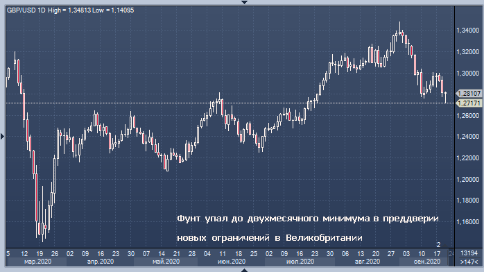Фунт упал до двухмесячного минимума по отношению к доллару во вторник в преддверии введения нового набора ограничений на передвижения граждан премьер-министром Великобритании Борисом Джонсоном для борьбы со второй волной вспышки коронавируса.