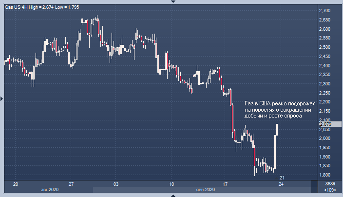 Природный газ в США продолжает свои полёты: с начала сентября он упал в цене более чем на 31%, однако сегодня динамика претерпела резкие изменения – октябрьский фьючерс прибавляет более 13%. Медведи активно фиксируют прибыль по коротким позициям после стабилизации у 7-недельного минимума в районе $1.80 и прогноза Refinitive, который предполагает снижение производства в нижних 48 штатах США до 83.8 млрд кубических футов в сутки уже сегодня и рост спроса (с учётом экспорта сжиженного природного газа) с 82.0 млрд до 84.4 млрд кубических футов на следующей неделе. Позитивным фактором также стали перспективы роста среднего уровня поставок газа в Мексику в сентябре до 6.0 млрд кубических футов в сутки с рекордных 5.9 млрд в августе.