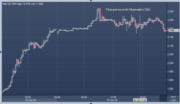 После впечатляющего рывка в ходе торгов в среду у быков на рынке газа в США остался порох в пороховницах — октябрьский фьючерс сегодня показал рост более чем на 5.5%. Впрочем, для торгов была характерна повышенная волатильность, а быкам, начавшим день с броска к свежим максимумам в районе $2.319 не удалось обновить их, несмотря на позитивный новостной поток, и к настоящему времени они ушли в оборону.