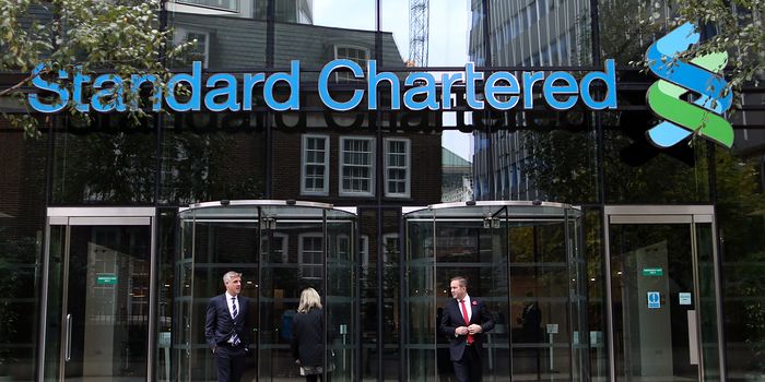 На этой фотографии посетители покидают штаб-квартиру Standard Chartered в Лондоне @ Bloomberg News