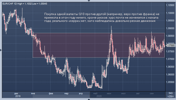 Покупка одной валюты G10 против другой (например, евро против франка) не принесла в этом году ничего, кроме рисков: курс почти не изменился с начала года, реального «кэрри» нет, зато наблюдались довольно резкие рыночные движения.