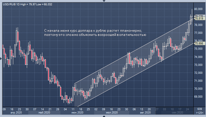 - во-вторых, с конца июня рубль дешевеет планомерно, поэтому этот процесс сложно объяснить простым ростом рыночной волатильности; и