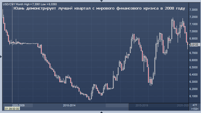 Спот-курс юаня открылся на уровне 6,8115 за доллар ранее и снизился до 6,8120 к полудню. Если юань сохранит всю прибыль к позднему вечеру, он прибавит 3,71% к доллару с июля по сентябрь, отмечая лучший квартал с первого квартала 2008 года.