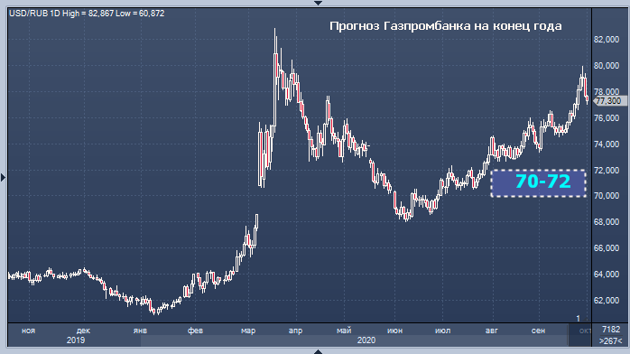 Газпромбанк решил не менять свой прогноз по курсу рубля на конец 2020 года: 70-72 руб./$1 при цене на нефть Brent $52 за баррель. В банке не уточнили, каким будет курс рубля в конце года, если цены на нефть останутся вблизи текущих уровней. Там лишь выразили обеспокоенность по поводу стремительного падения российской валюты, связав это с ростом геополитической напряженности в мире, и веру, что потрясения скоро закончатся — уже до конца года.