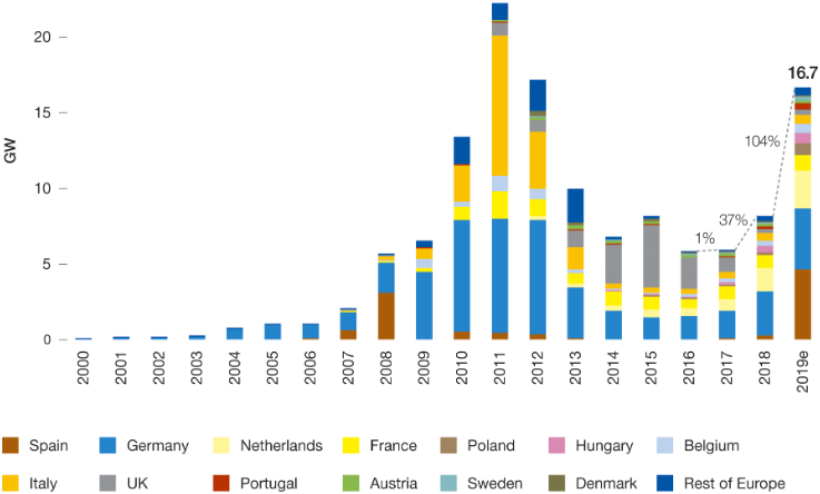 По данным SolarPower Europe, в 2019 году сектор солнечной энергетики Европы вырос на 104% г/г (+16.7 ГВт, см. график выше), что стало рекордным показателем с 2010 года. Процесс возглавила Испания, увеличившая свои солнечные мощности на 4.7 ГВт, а за ней последовали Германия (+4 ГВт), Голландия (+2.5 ГВт), Франция (+1.1 ГВт) и Польша (+0.784 ГВт).