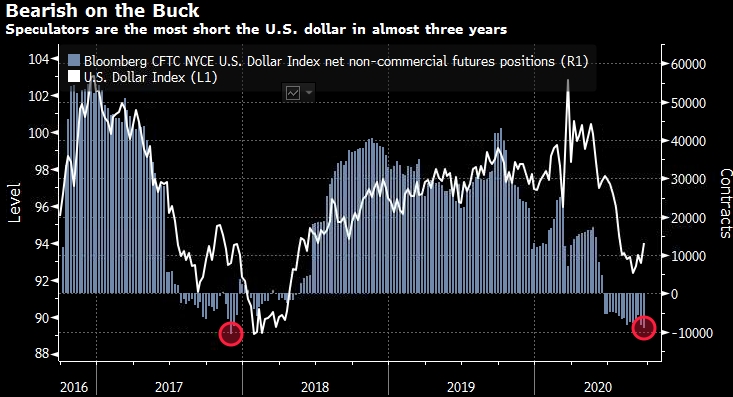 Во время этого ралли, крупнейшего с апреля, спекулятивные трейдеры на удивление увеличили свои ставки против доллара. Согласно последним данным Комиссии по торговле товарными фьючерсами, позиция по фьючерсам на индекс доллара США является наиболее медвежьей с ноября 2017 года.