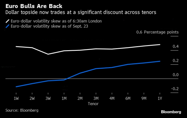 Это совпало с изменением взглядов и на рынке опционов, где стоимость хеджирования роста евро в настоящее время довольно высока по многим тенорам. Неделю назад трейдеры придерживались медвежьего настроя по опционам по евро, срок действия которых истекал до месяца.