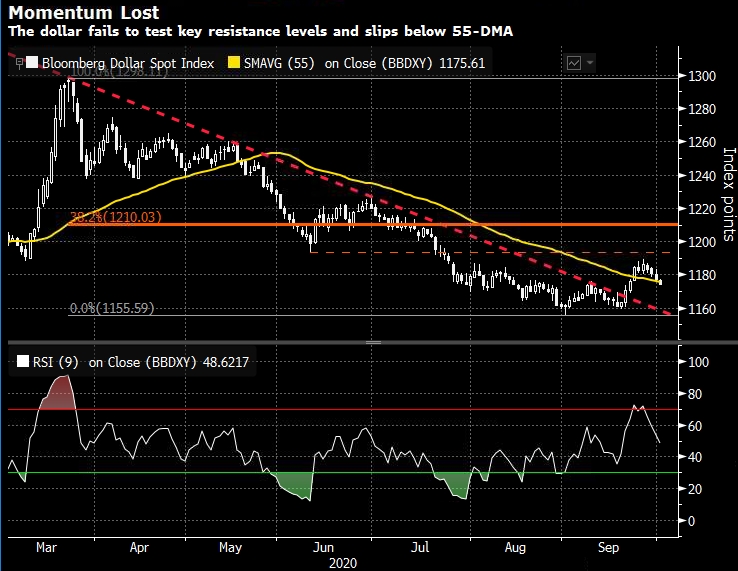 Самое сильное ралли доллара за пять месяцев, возможно, уже исчерпало себя. Позиционирование инвесторов, рынки опционов и технический анализ говорят о том, что долгосрочные перспективы доллара остаются негативными. Курс доллара по отношению к его основным аналогам уже потерял половину роста на 2,6% в период с 18 по 25 сентября.