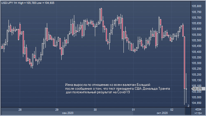 Иена выросла по отношению ко всем валютам Большой десятки, поскольку инвесторы искали активы-убежища после сообщения о том, что тест президента США Дональда Трампа дал положительный результат на Covid-19. Доллар и казначейские облигации продолжили рост.