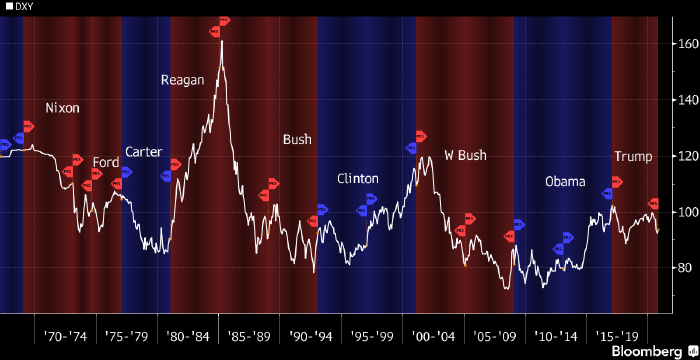 Приведенная выше иллюстрация отражает динамику индекса доллара DXY при президентах- республиканцах (красным) и президентах-демократах (синим)