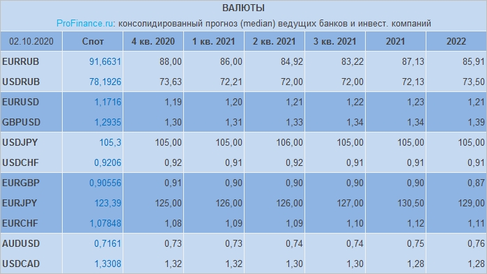 При этом прогнозы по рублю ухудшиилсь. Если в сентябре EURRUB и USDRUB прогнозировались на конец 2020 г. на уровне 86,40 и 72,00 соответственно. То сейчас оценки предполагают 88 рублей за евро и 73,63 рубля за доллар.