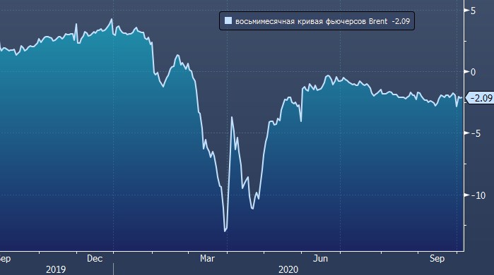 Приведенный выше график отражает восьмимесячную кривую фьючерсов на нефть Brent (декабрь 2020 минус август 2021) в долларах за баррель. Пока на рынке наблюдается контанго, которое, по прогнозу Morgan Stanley, через год превратится в бэквордацию