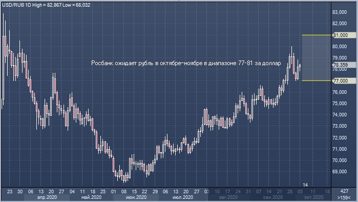 Росбанк ожидает рубль в октябре—ноябре в диапазоне 77–81 за доллар.