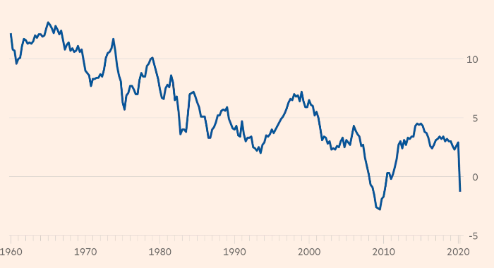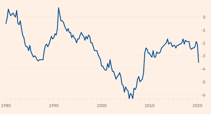 Причина известна: резкое сокращение внутренних сбережений на фоне зияющей дыры в бюджете. Во втором квартале 2020 года чистые внутренние сбережения — показатель, учитывающий сбережения домохозяйств, компаний и государственного сектора с поправкой на инфляцию — вышел на отрицательную территорию и достиг −1.2%. Последний раз такое было во время мирового финансового кризиса. Более того, в квартальном исчислении показатель упал более чем на 4% а такие глубокие просадки фиксировались лишь в послевоенное время, в 1947 году.