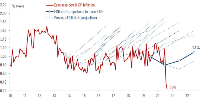 Приведенный выше график отражает динамику HICP Еврозоны (красным), прогнозы руководства ЕЦБ (синим) и его предыдущие прогнозы (синий пунктир)
