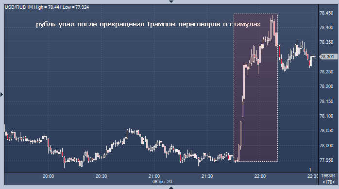 Акции США упали, курс доллара повсеместно растет, рубль резко упал после того, как президент Дональд Трамп заявил, что прекращает переговоры о пакете налогово-бюджетного стимулирования экономики до завершения президентских выборов, всего через несколько часов после того, как председатель Федеральной резервной системы Джером Пауэлл повторил свое предупреждение о том, что без дополнительной фискальной поддержки экономика погрузится в новую рецессию. До Пауэлла с призывом к мировым лидерам обратилась глава МВФ, заявив, что мировая экономика нуждается в дальнейшем стимулировании.