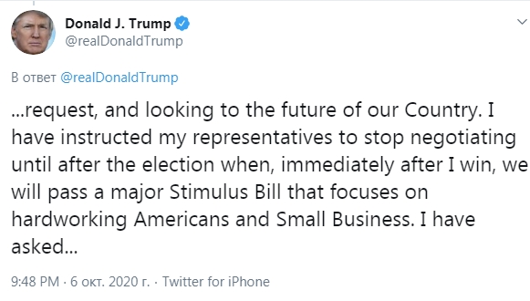 Спикер палаты представителей Нэнси Пелоси призвала республиканцев поддержать версию законопроекта о стимулах, который палата представителей приняла на прошлой неделе благодаря демократам. Но между предложением демократов о выделении 2,2 триллиона долларов и предложением на 1,6 триллиона долларов, поддержанным Белым домом, оставался значительный разрыв. Вчера и сегодня Пелоси и Мнучин по телефону пытались найти компромисс. Но, вероятно, выздоровевший Трамп посмотрел на проблему по-новому, оценив, как эта проблема повлияет на его шансы на выборах. По последним опросам, он уступает Байдену.