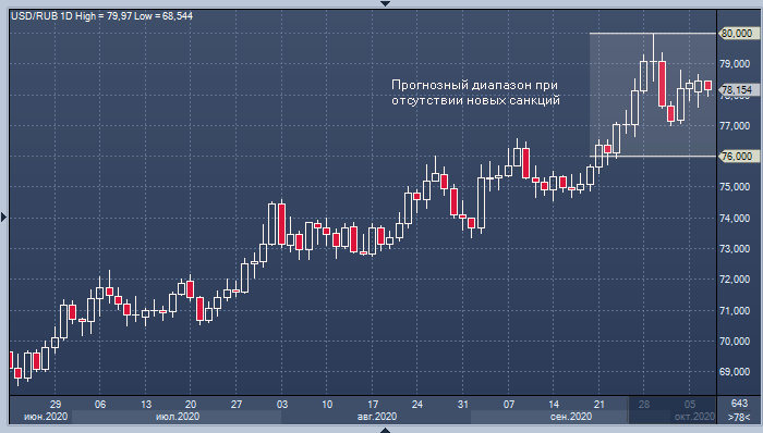 По их оценкам, теперь рынок достиг такого состояния, что движение доллар/рубля выше 80 потребует «конкретных свидетельств» неминуемости новых санкций. И напротив: до тех пор, пока риски введения санкций сохраняются, пара вряд ли опустится заметно ниже 76 как минимум до выборов президента США (если только не произойдет резкого роста цен на нефть).