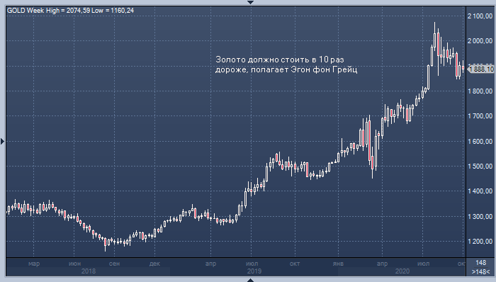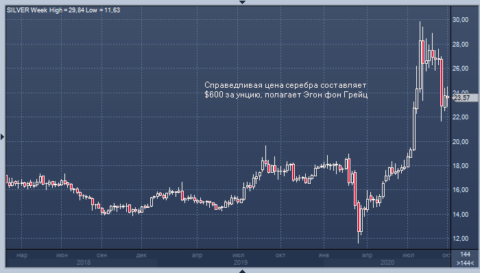 «Никто не верит в эти прогнозы по золоту и серебру», - говорит Эгон фон Грейц. - «Люди просто экстраполируют годовой рост на несколько процентов. Но сейчас не та ситуация: цены на драгоценные металлы будут расти не постепенно, а по экспоненте, точно так же как по экспоненте растет денежная масса и дефициты».