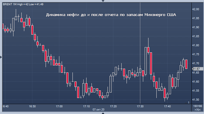 На графике периодом свечи в 1 минуту видим движение цены нефти после данных по запасам