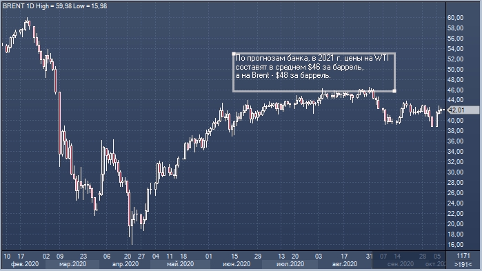 По прогнозам банка, в 2021 г. цены на WTI составят в среднем $46 за баррель, а на Brent — $48 за баррель. Банк повысил эти прогнозы на $1,15 и $0,30 соответственно.