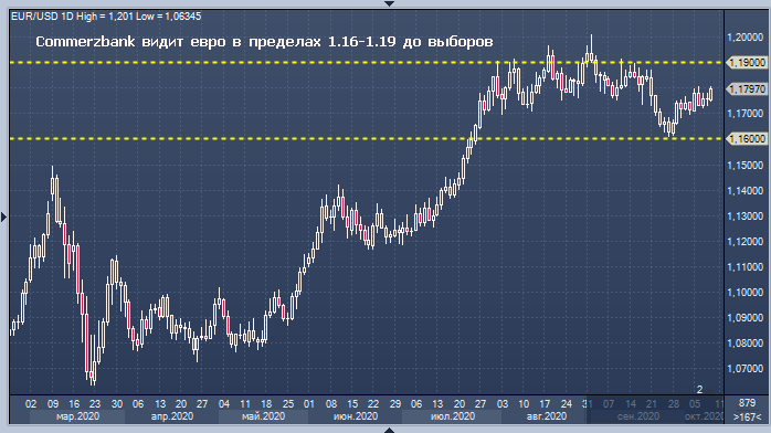 Единая европейская валюта выросла по отношению к доллару (EUR/USD) на 0,36% до 1,1800 на торгах в пятницу и, вероятно, будет торговаться в «достаточно узком диапазоне» между 1,16 и 1,19 до предстоящих выборов в США, говорит валютный стратег Commerzbank Антье Прафке.
