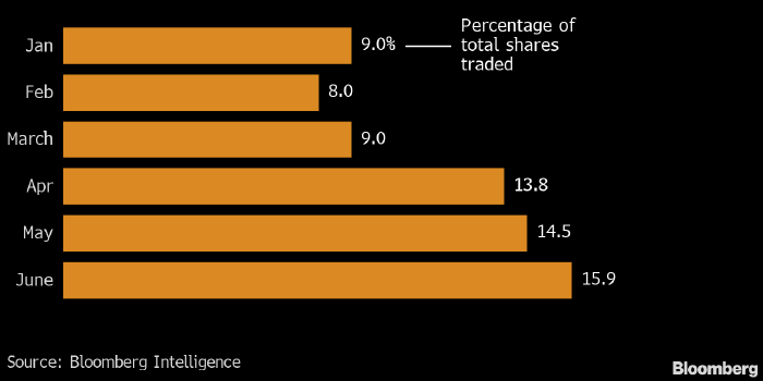 Приведенный выше график отражает динамику изменения доли розничных инвесторов в общем объеме торгов на рынке акций США с января по июнь 2020 года