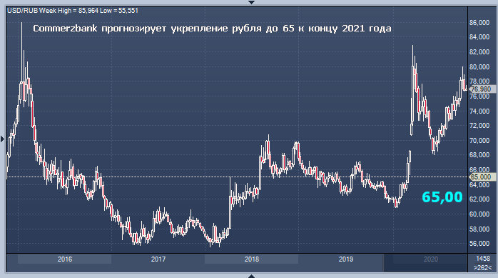 Соответственно, Commerzbank повышает прогноз курса доллара США к рублю на конец года до 76,00 с 70,00.