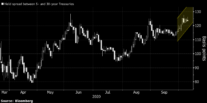 Поведение рынков в последние дни говорит о том, что инвесторы все меньше верят в скорое согласование нового стимулирующего пакета. Подобная уверенность должна была бы оказать поддержку акциям циклических компаний и спровоцировать рост доходности облигаций. Однако вместо этого фондовый рынок показал вчера сильную динамику благодаря взлету бумаг Apple и Amazon, а на дневном графике спреда доходности между 5- и 30-летними трежерис в пятницу сформировалась медвежья свеча (см. график в начале статьи — прим. ProFinance.ru), что говорит об уменьшении надежд на инфляцию.