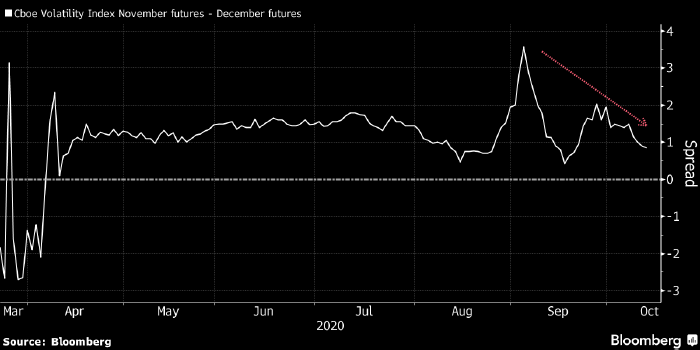 Месяцами инвесторы опасались, что проигравший кандидат оспорит итоги выборов президента США, и последующие судебные разбирательства продлятся еще недели или даже месяцы. Эти соображения заставляли участников рынка ставить на рост волатильности, ожидавшейся сразу после голосования 3 ноября. В частности, они покупали ноябрьские и декабрьские фьючерсы на VIX, а также пут-опционы на S&P 500 с экспирацией после 3 ноября.