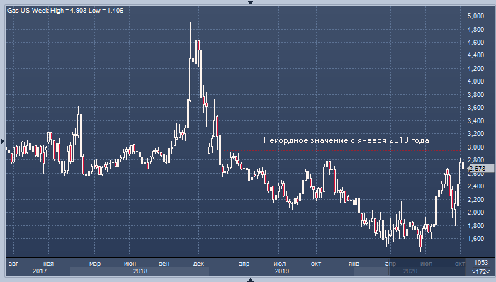 В понедельник цены на газ в США вплотную подобрались к $3 за MMBtu (млн британских тепловых единиц), что стало рекордным значением с января 2018 года. Произошло это на фоне прогнозов о грядущем серьезном похолодании в стране, которое предполагает повышение спроса на топливо для обогрева.