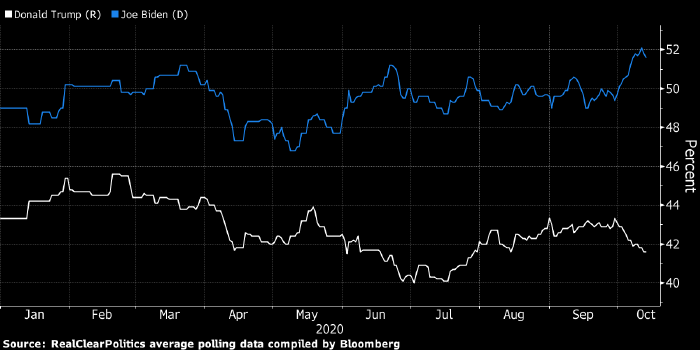 Приведенный выше график отражает динамику рейтингов Трампа (белым) и Байдена (голубым) в соцопросах. Данные RealClearPolitics, обработанные агентством Bloomberg