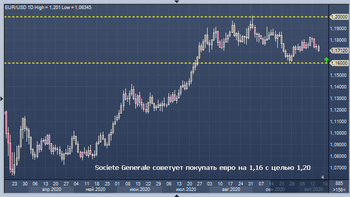 Евро может продолжить ослабление и протестировать ключевой уровень поддержки $1,17, если в четверг фондовые индексы США продолжат снижаться и будут способствовать перетоку капитала в безопасный доллар, сообщает Societe Generale. Сентябрьский минимум чуть выше 1,16 доллара может "попасть в поле зрения", - говорит Кит Джукс из SocGen.