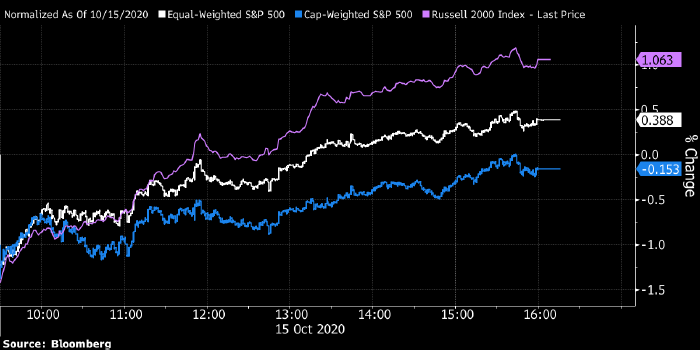 Приведенный выше график отражает вчерашнюю динамику индекса Russell 2000 (фиолетовым), равновесного индекса S&P 500 (белым), и взвешенного по капитализации индекса S&P 500 (голубым)