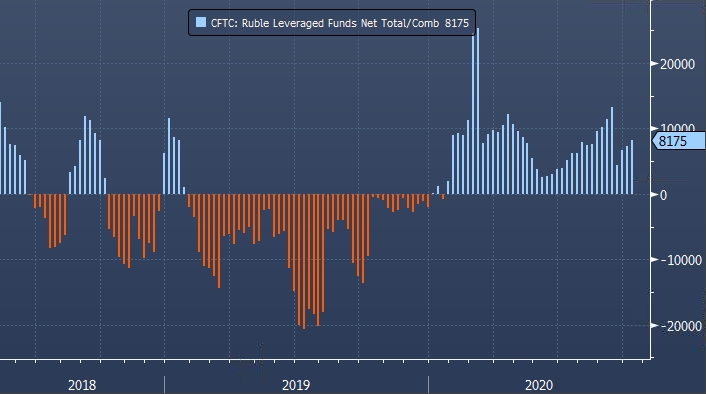 Если оценить статистику CFTC по рублю более подробно, то можно отметить, что сальдированная длинная позиция тех участников рынка, которые торгуют с кредитным плечом (leveraged funds), выросла на 11% (806) до 8 175 контрактов на отчетной неделе. Показатель растет третью неделю подряд.