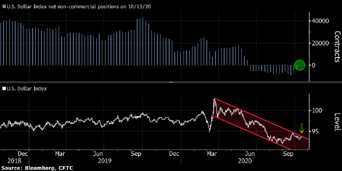Американские спекулянты передумали продавать доллар и впервые за последние четыре месяца ставят на его рост, следует из последних данных Американской комиссии по торговле товарными фьючерсами (CFTC). Чистая спекулятивная позиция во фьючерсах на индекс доллара DXY вышла в положительную территорию впервые с июня.