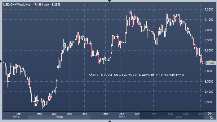 Юань готовится штурмовать двухлетние максимумы в паре с долларом после вчерашней публикации неплохих данных по ВВП Китая за третий квартал. Однако другие рискованные активы остаются под давлением накануне истечения ультиматума, который Нэнси Пелоси поставила перед республиканцами по поводу согласования нового пакета стимулирующих мер. Если этого не будет сделано сегодня, то, скорее всего, до выборов 3 ноября этого не произойдет совсем.