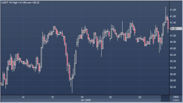 По итогам вторника, 20 октября, цена WTI выросла на 1.5% до $41,5 за баррель, декабрьские фьючерсы на Brent выросли на 0,4% до $42,80 за баррель.