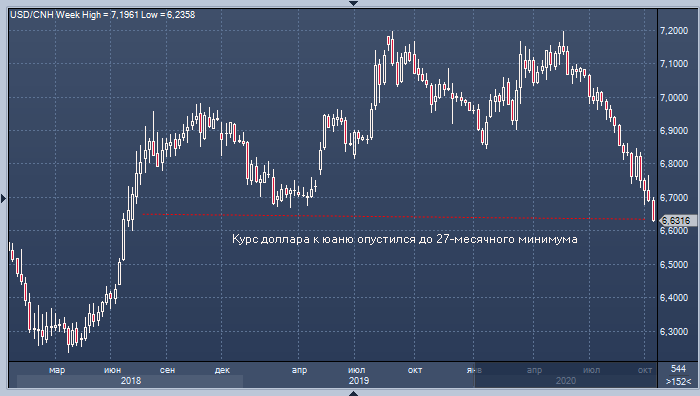 Ожидания скорого согласования нового пакета стимулов в США заставляют инвесторов покупать рискованные активы. На этом фоне индекс доллара BBDXY опустился до рекордно низких значений с 18 сентября, а китайский юань заметно подорожал благодаря уверенному восстановлению экономики страны.