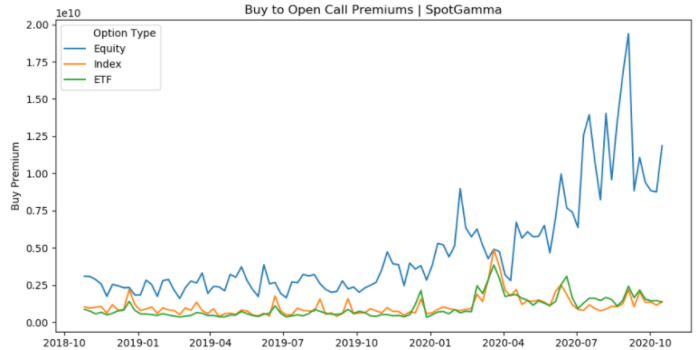 Приведенный выше график отражает динамику спроса на кол-опционы на отдельные акции (голубым), на индексы (оранжевым) и на биржевые фонды (ETF, зеленым)