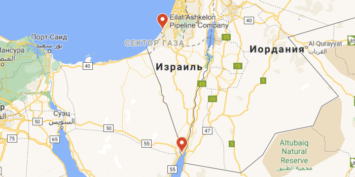 Отметками на карте обозначены порты Эйлат (внизу) и Ашкелон (вверху)