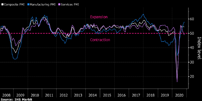 «Радует, что экономика Германии показывает определенную стойкость», - отмечает экономист IHS Markit Фил Смит.- «Несмотря на вторую волну пандемии, спад в секторе услуг страны пока носит ограниченный характер».