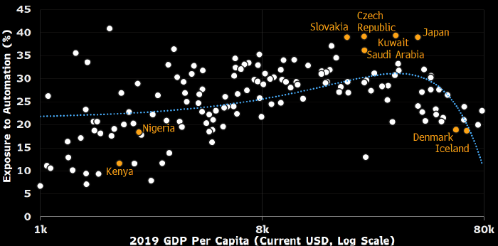 Приведенный выше график отражает процент рабочей силы в некоторых странах, который рискует лишиться работы из-за автоматизации (вертикальная шкала), и ВВП на душу населения в этих странах в долларах США (горизонтальная шкала)