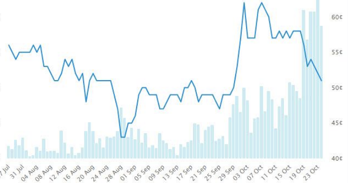 Приведенный выше график отражает вероятность одновременной победы демократов на выборах президента США и в Сенат (коэффициенты букмекера PredictIt). Бирюзовые столбцы на графике отражают объем принятых ставок