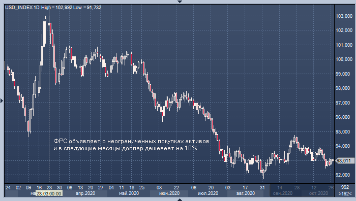 «Мой базовый сценарий заключается в том, что период умеренной слабости доллара продлится еще один-три года», - сообщил эксперт в интервью Bloomberg. - «Независимо от исхода выборов в США, некоторые события в области монетарного и бюджетного стимулирования уже произошли. Снижение доллара может временно прерваться в зависимости от результатов голосования, однако затем оно возобновится».
