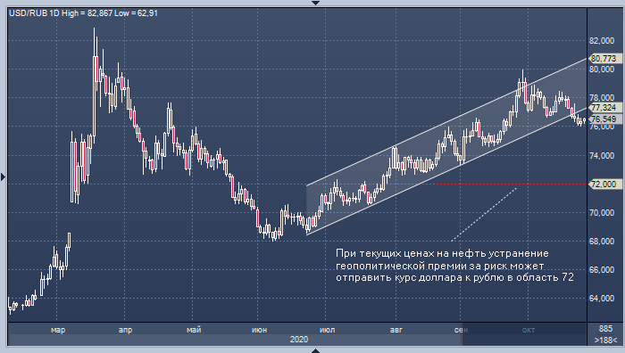 Эксперт указывает на сильные фундаментальные показатели России и прогнозирует, что при текущих ценах на нефть устранение геополитической премии за риск может отправить курс доллара к рублю в область 72.