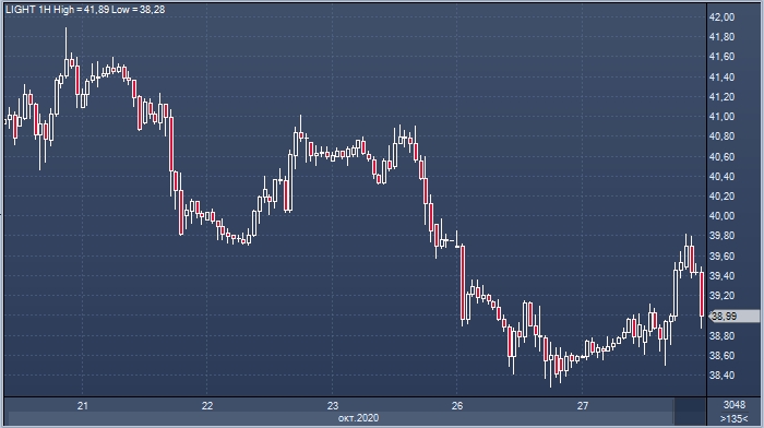 По итогам вторника, 27 октября, цена WTI выросла на 1,05% до $38,99 за баррель, декабрьские фьючерсы на Brent выросли на 0,6% до $40,70 за баррель.